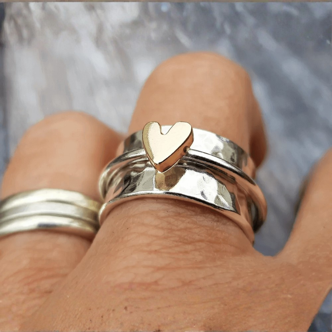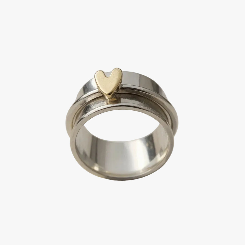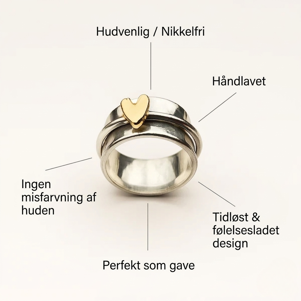 Hjertebånd forener klassisk elegance med en legende detalje. Denne smukke sølvfarvede ring er prydet med et fint gyldent hjerte, der hviler på en bevægelig midterdel, som diskret kan drejes. Det er et tidløst symbol på kærlighed og indre ro, designet til at være din trofaste følgesvend gennem både hverdagens travlhed og særlige øjeblikke.